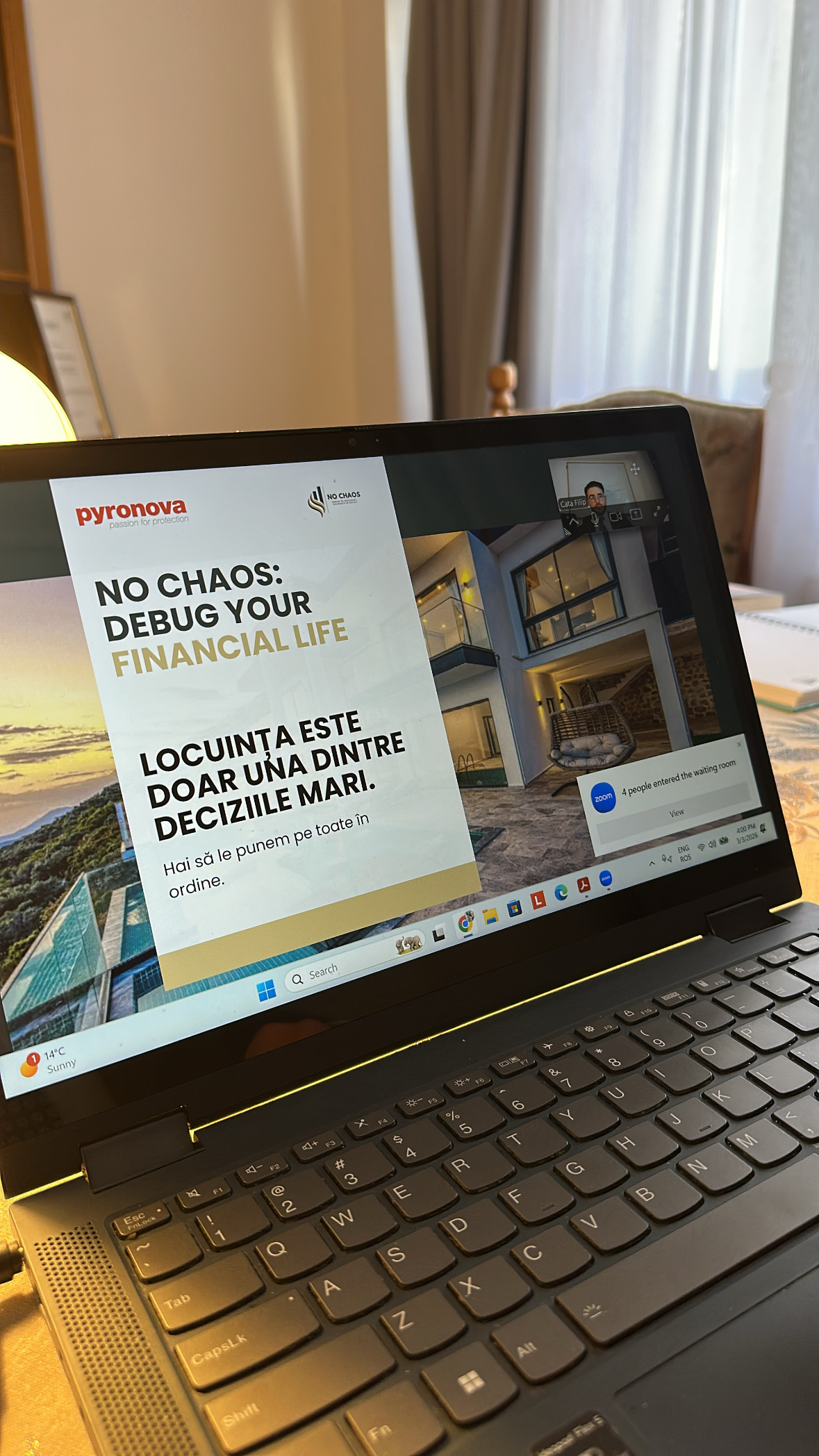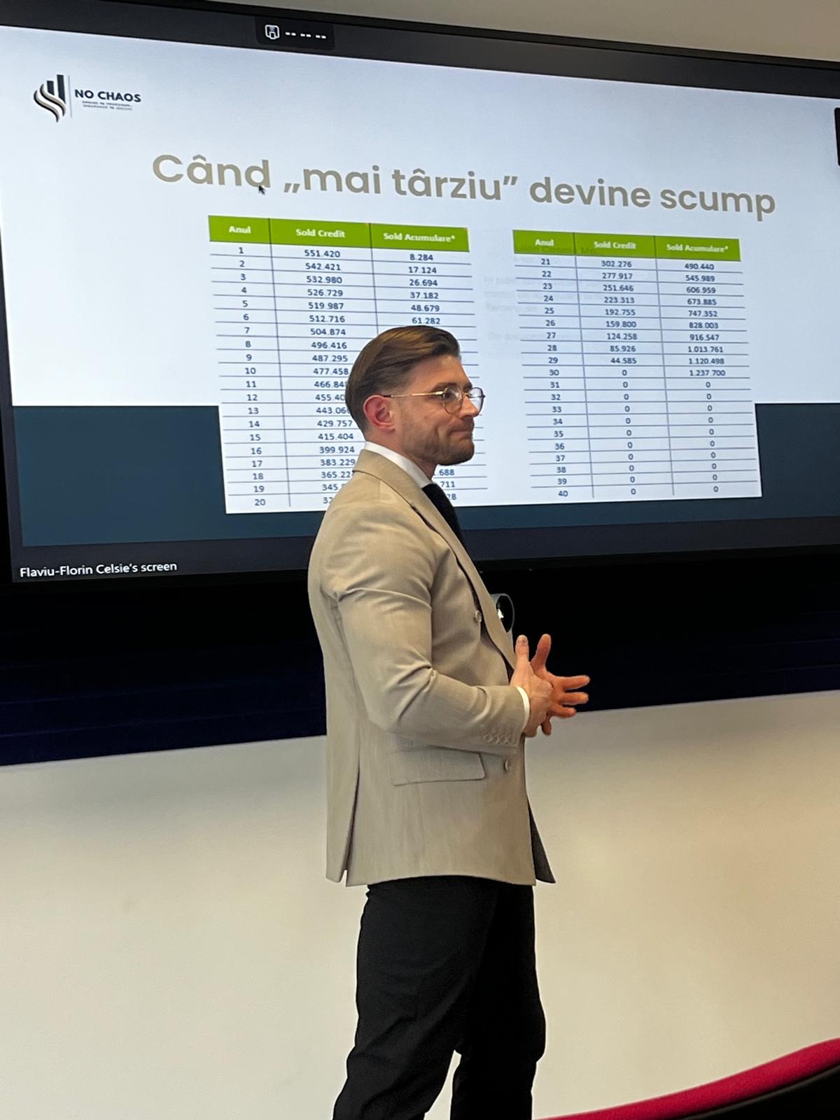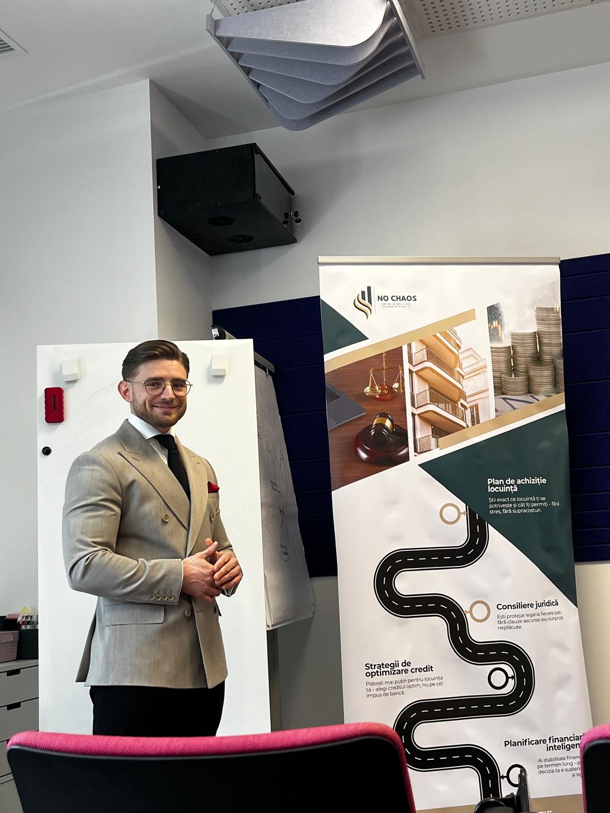 ,,Vreau să-mi cumpăr un imobil, iar cei de la No Chaos m-au ajutat cu toți pașii necesari pe care să-i urmez alături de ei, atât financiar, cât și juridici. M-au ajutat să văd real cât îmi permit să plătesc rate, și mai mult să înțeleg că nu merită pentru mine să fac o achiziție acum. Am pus împreună cu ei pe foaie și un alt obiectiv important, și anume, retragerea din activitate, pentru care am primit un plan de bugetare și de investiții adaptat nivelului meu de risc. În paralel, am continuat planul de economisire pentru achiziția casei precum și pentru costurile legate de mutare pentru că ne dorim să fie o casă spațioasă pentru copii”
